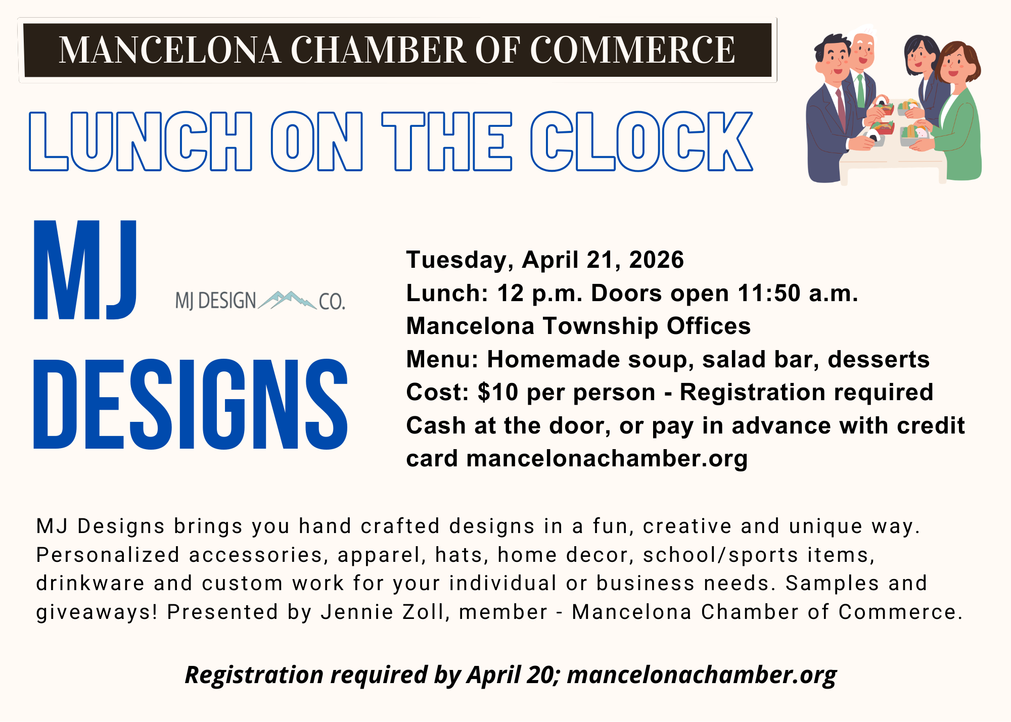 From hobby to thriving business, Mancelona Chamber of Commerce member Jennie Zoll (MJ Design Co) shares how her Cricut hobby turned into a successful business. MJ Design specializes in hand crafted designs, and imprinted/personalized accessories for home, apparel, business, and sports. Free samples, give-aways, and door prizes.